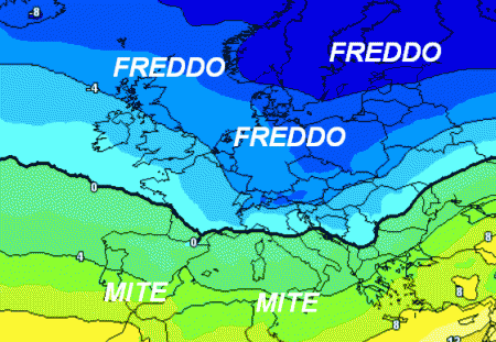 Secondo questa mappa, il freddo e le eventuali nevicate a bassa quota potrebbero interessare il nord e parte delle regioni centrali. Sul resto d’Italia vigerebbe un clima maggiormente mite, con la neve che si farà vedere solo a quote elevate.