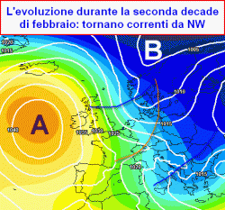 Prima di allora, chi pensava alla prosecuzione delle severe condizioni invernali siberiane, rimarrà deluso, perchè dopo l’ultimo nucleo gelido atteso tra venerdì 10 e domenica 12 e le conseguenze nevose su più di mezzo Paese, torneranno a manifestarsi segnali di un’invasione di correnti nord-occidentali, lungo il bordo orientale del solito anticiclone presente sull’ovest del Continente, ulteriormente potenziato nei suoi valori dalla recente intrusione di aria fredda, fino a fare di lui una figura ibrida.