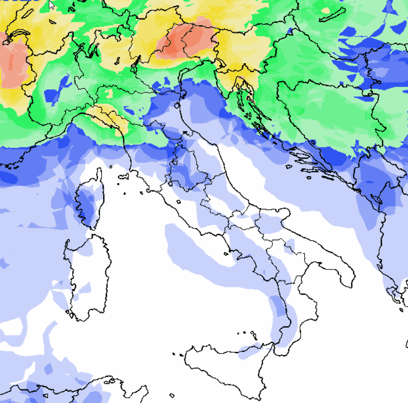 E’ evidente come il settentrione e l’alta Toscana avranno una probabilità di pioggia MEDIA o addirittura ELEVATA dove vedete il colore tendente al rosso. Sul resto d’Italia le condizioni meteorologiche risulteranno più stabili con una probabilità di pioggia BASSA o del tutto NULLA dove vedete il colore bianco.