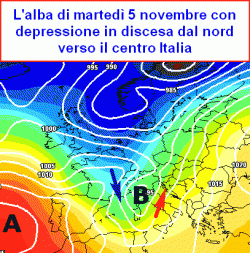 martedì 5 novembre: maltempo al centro-sud con piogge e temporali anche intensi, al nord coperto con piogge sparse e neve oltre i 1700m, tendenza a miglioramento al nord. Temperature in calo ovunque.