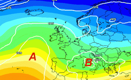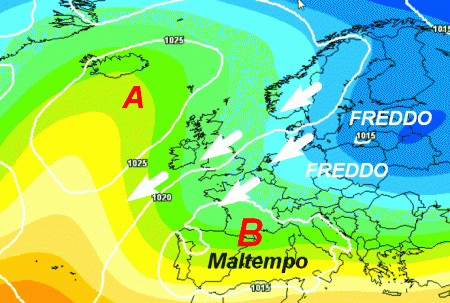 Il suo allungo verso nord in direzione dell’Islanda faciliterebbe inoltre la discesa di correnti fredde da nord-est (frecce bianche) con la creazione di una depressione sul Mediterraneo foriera di tempo perturbato da nord a sud