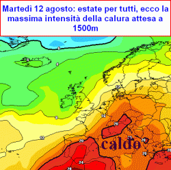lunedì 11 e martedì 12 agosto: soleggiato e caldo, anche nelle vallate alpine, intenso nelle zone interne delle isole, ma anche su Toscana, Lazio, Puglia, Valpadana, in particolare Emilia-Romagna.
