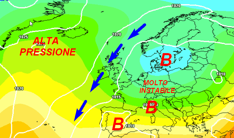 Osservate dove andrà a finire l’alta pressione, addirittura in sede islandese. Notate l’aria fredda che scenderà sulle coste occidentali del Continente; con un “giro di boa” metterà l’Italia sotto un gomito di correnti instabili e fresche provenienti da ovest.
