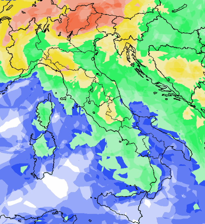 Il riscontro precipitativo per la giornata in questione sarà il seguente, ricordando che: in blu probabilità di pioggia bassa (sotto al 25%), in verde medio-bassa (fra 25 e 50%), in giallo medio-alta (fra 50 e 75%) e in rosso alta o molto alta” (oltre il 75%).