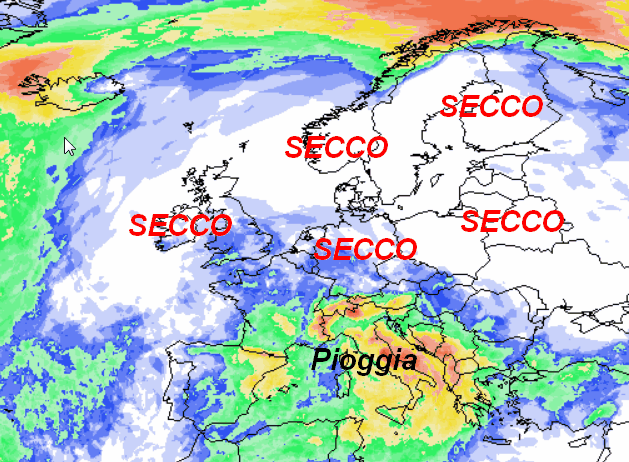 Notate l’enorme blocco secco disposto sui meridiani centrali e settentrionali del nostro Continente dove sarà presente l’alta pressione. Osservate inoltre la vasta area instabile che terrà sotto scacco non solo l’Italia, ma tutto il Mediterraneo e l’Europa meridionale, dove la probabilità di precipitazioni sarà anche elevata.