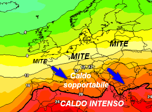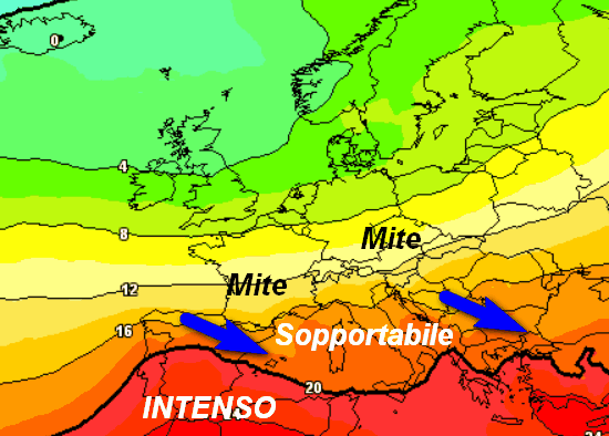 Notiamo la linea nera che separa il caldo intenso da una condizione più sopportabile, spostarsi più a sud a lambire al massimo la Sicilia e le estreme regioni meridionali. Sul resto d’Italia verranno introdotte condizioni meteoclimatiche decisamente più sopportabili, senza punte termiche o di disagio eccessive.