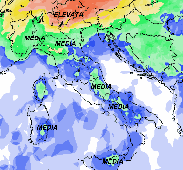 Probabilità di temporali ELEVATA sull’arco alpino centro-orientale e pianure sottostanti; MEDIA sul resto del settentrione, alta Toscana, zone interne del centro-sud e della Sicilia, unitamente alla Sardegna interna. Su tutte le altre regioni la probabilità di temporali sarà BASSA o NULLA.