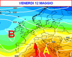 La parziale "forzata" delle correnti occidentali nei confronti del cuneo anticiclonico (per altro abbastanza debole), dovrebbe avvenire durante il secondo fine settimana di maggio.