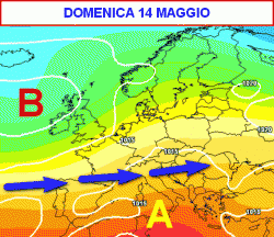 La seconda mappa, valida per domenica 14 maggio, ci mostra la successiva "piallata" del cuneo bollente, con l’ingresso sull’Italia di correnti più fresche (ed instabili) dai quadranti occidentali.