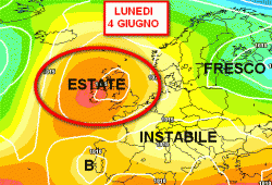 Come si evince dalla cartina di fianco riportata e valida per la giornata di lunedì 4 giugno, il bel tempo ed il caldo (insoma, l’estate) sembrano prediligere ancora le Isole Britanniche. L’Italia e l’Europa centrale si troveranno sotto correnti moderatamente instabili e fresche, che impegneranno i cieli di queste nazioni con molta nuvolosità e anche precipitazioni.