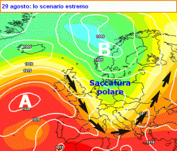 Da segnalare in particolare lo scenario proposto dalla corsa di controllo del modello americano, una importante voce fuori dal coro rispetto alle altre linee previsionali, che vede sprofondare per la fine del mese una vasta saccatura polare dalla regione scandinava verso il Mediterraneo centrale e l’Italia, con successivo trasferimento sull’area balcanica: si tratta al momento di un’ipotesi estrema (probabilità 25%), che vedrebbe un primo serio inciampo dell’estate tra il 28 e il 31 agosto.