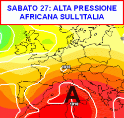 La cartina qui di fianco riportata evidenzia la situazione prevista per sabato 27 luglio in Italia. Tempo stabile, ma anche caldo, soprattutto al centro-sud, stante l’ingerenza dell’alta pressione africana.