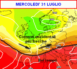 Come mostra la seconda cartina, valida per la giornata di mercoledì 31 luglio, il settentrione e parte dell’Italia centrale potrebbe finire sotto un tempo più instabile e meno caldo, proprio per la maggiore ingerenza delle correnti atlantiche sopra citate.