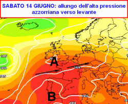 Sul finire della prossima settimana, l’alta pressione africana verrà sostituita dall’anticiclone delle Azzorre, come dimostra la cartina valida per la giornata di sabato 14 giugno.