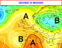 La linea di tendenza che le carte fiutano per giovedì 30 maggio ci mostra un’Italia complessivamente sotto il sole, anche se un po’ d’instabilità pomeridiana si farebbe vedere nel pomeriggio su Alpi e Appennini.
