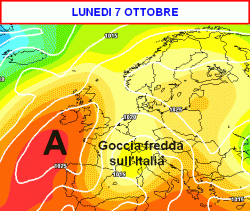 Successivamente, l’alta pressione rimonterà nuovamente, ma questa volta non lungo i meridiani centrali europei, bensì molto ad ovest, sul Vicino Atlantico. Ciò potrebbe determinare l’apertura di un canale instabile che dal nord Europa si dipartirebbe verso la nostra Penisola. Al suo interno diverse gocce fredde, una delle quali la vedete in piena azione sull’Italia nella giornata di lunedì 7 ottobre.