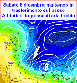 domenica 9 dicembre: maltempo su medio Adriatico, meridione, bello altrove ma ventoso e freddo, neve sino in collina sul medio Adriatico, oltre i 700-800m sull’Appennino meridionale.