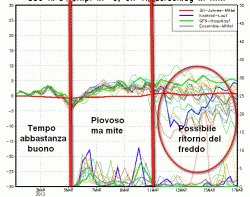 Successivamente, dal giorno 6 al giorno 11 marzo, potrebbe subentrare un tempo piovoso, ma in un contesto non molto freddo. Se si osservano difatti le temperature a 1500 metri di quota ( i picchi in mezzo al grafico), esse sono per tutto il periodo al di sopra della linea rossa ( che è la media), mentre le precipitazioni ( picchi a fondo grafico) risultano abbastanza consistenti.