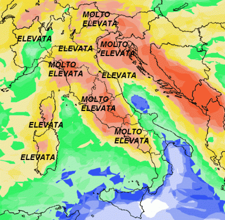 Tranne forse le estreme regioni meridionali e la Sicilia, sul resto d’Italia la probabilità di pioggia viene giudicata elevata o molto elevata dove vedete il colore rosso. Il verde testimonia invece una probabilità di pioggia media, mentre il blu una probabilità bassa.