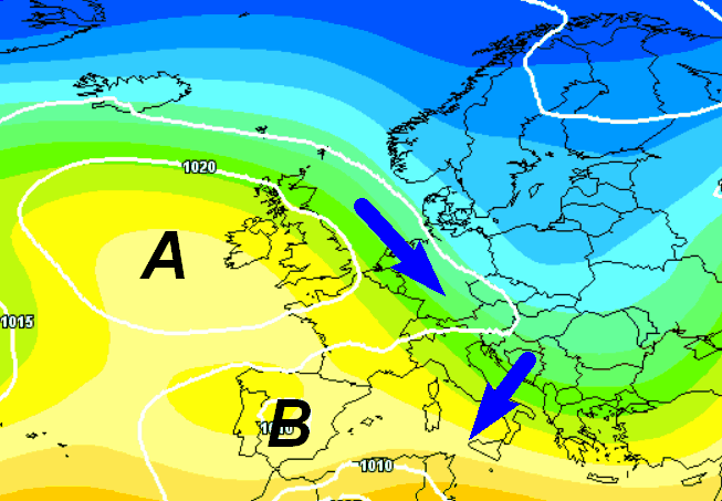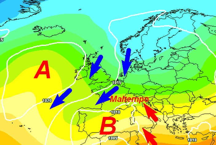 Le regioni settentrionali e parte di quelle centrali saranno interessate da una confluenza tra aria fredda di matrice nordica (frecce blu) con aria più calda in risalita dal nord Africa (frecce rosse). Tutto ciò darà origine ad episodi di maltempo anche abbastanza frequenti. Il resto d’Italia si troverà invece sotto il tiro dell‘aria più calda con cieli spesso velati o lattiginosi, ma senza precipitazioni importanti.