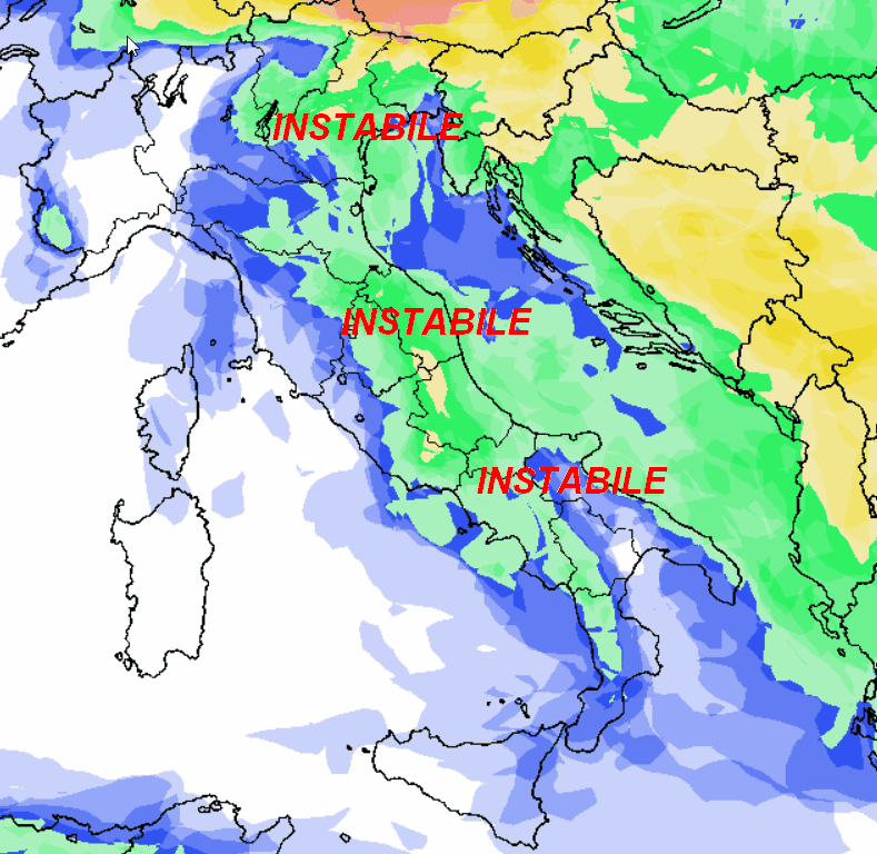 Notiamo che la maggiore probabilità di pioggia (rovesci e qualche temporale) si concentrerà tra il nord-est, il versante adriatico, le aree interne e il meridione peninsulare. Sul resto d’Italia la probabilità di pioggia sarà più bassa ed in alcuni casi anche nulla, dove vedete il colore bianco sulla mappa.