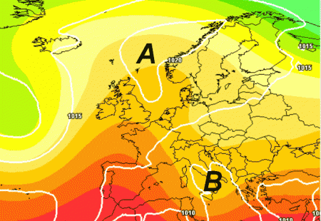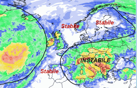 L’alta pressione si protenderà con un ampio promontorio dalla Penisola Iberica all’Europa centro-settentrionale: qui il tempo sarà stabile ed in prevalenza soleggiato. Da noi, come si evince dalla mappa, resterà un’ansa depressionaria piena zeppa di instabilità che seguiterà a controllare il tempo da nord a sud con rovesci e temporali sparsi.