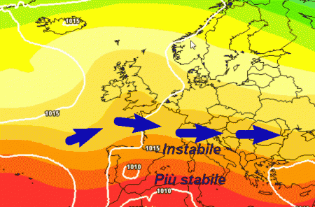 Notiamo una circolazione occidentale instabile (frecce blu) che potrebbe interessare il settentrione e parte del centro. Più stabile e caldo risulterebbe invece il tempo al meridione e sulle Isole, zone lambite da un blando promontorio anticiclonico di matrice africana.