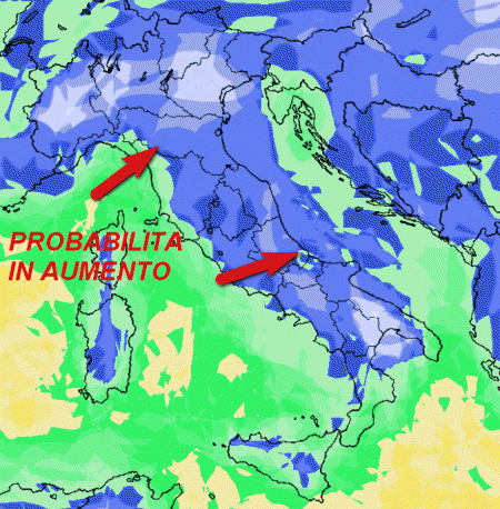 Probabilità di pioggia in aumento a partire dai settori occidentali, ma in tendenza anche sul resto d’Italia.