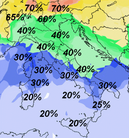 Al nord notiamo una probabilità tra il 40 e il 60%, con punte di 70% sulle Alpi. Al centro punte di 40% tra il versante adriatico e le zone interne, mentre al sud e sulle Isole e sul Tirreno la medesima probabilità si aggira al momento tra il 20 e il 30%.