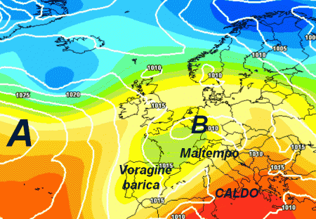 Vi sono diverse cose da osservare: il lungo ponte di alta pressione disteso dal vicino Atlantico alla Scandinavia, posizionato in modo alquanto anomalo per la stagione