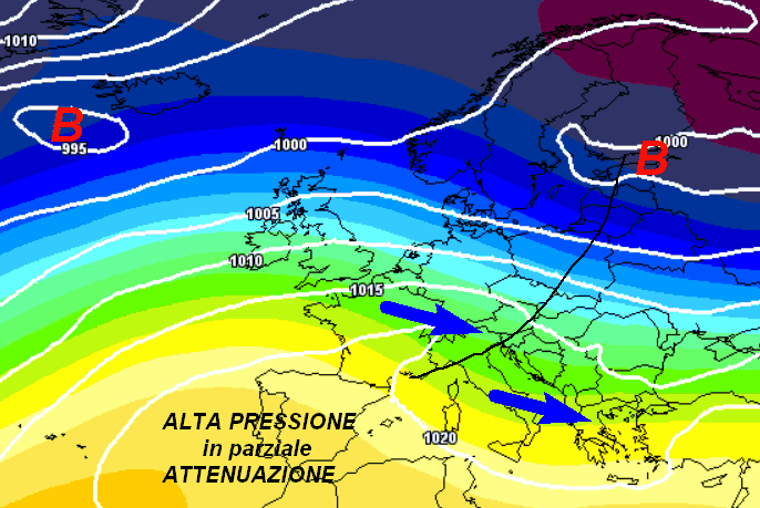 Facendo un paragone con la prima mappa postata sopra, si nota una riduzione ed un calo della forza anticiclonica sull’Europa occidentale, anche se non si potrà ancora parlare di una sua dipartita. Tutto ciò offrirà una spalla di correnti nord-occidentali relativamente fredde ed instabili che potrebbero interessare la nostra Penisola anche con qualche fenomeno.