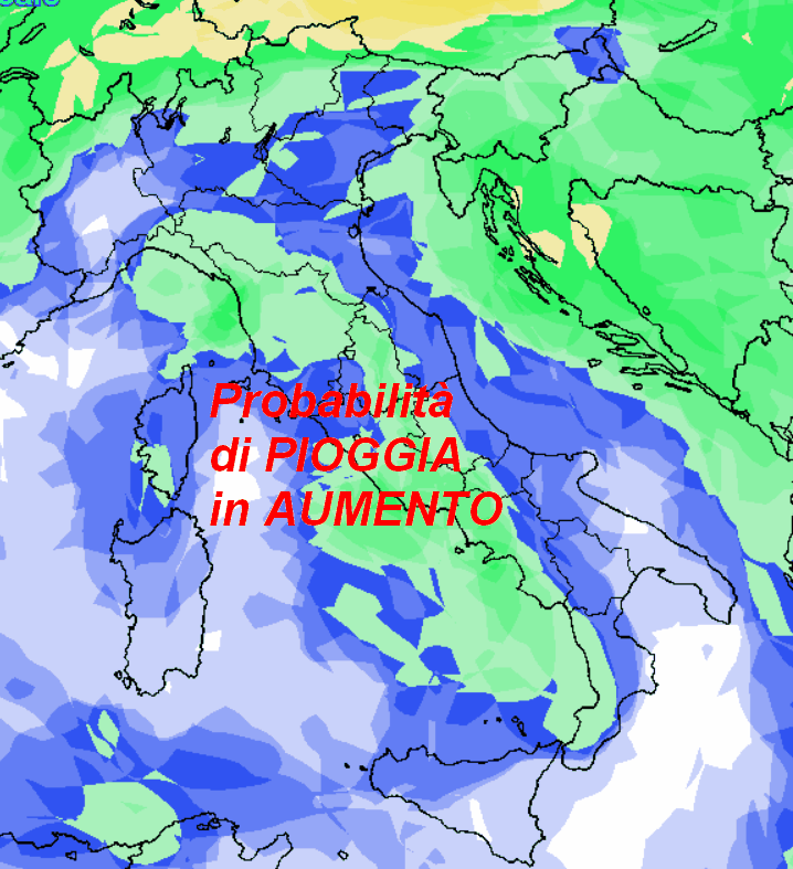 In altre parole, avremo un tempo maggiormente variabile con un lento aumento delle precipitazioni, come mostra la cartina della probabilità di pioggia a scala italica per la medesima giornata, ovvero lunedi 5 febbraio: