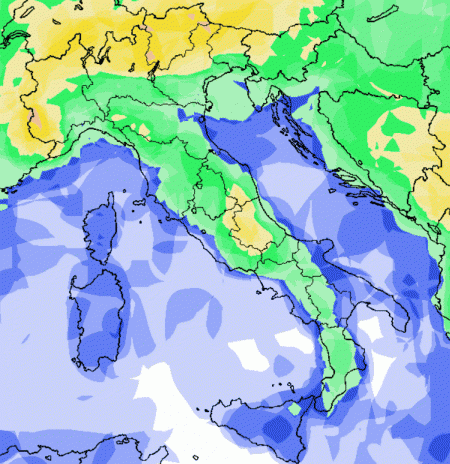 Notiamo le Alpi e le aree interne del centro e del meridione con una probabilità di pioggia elevata o molto elevata. Le altre aree avranno una probabilità media ad eccezione delle Isole dove il rischio di pioggia sarà più basso.