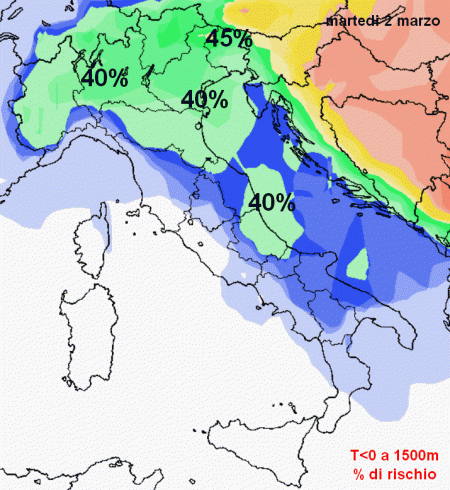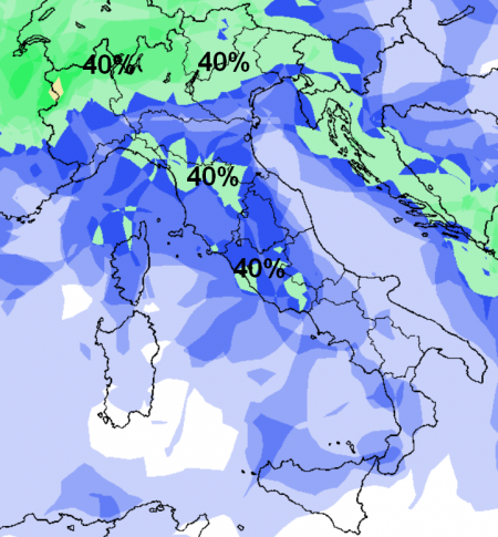 La probabilità che l’aria fredda rientri da est (senza provocare precipitazioni) risulta discreta anche secondo queste mappe, che gli attribuiscono un 40-45% di chances al nord e lungo il versante adriatico dell’Appennino:
