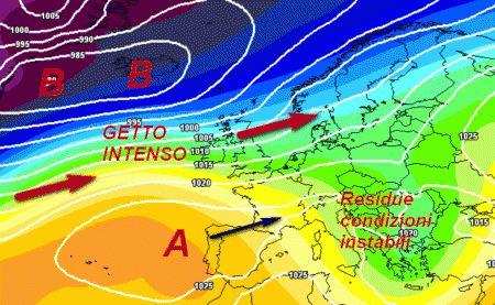 Si nota molto bene la spinta del getto alle alte latitudini che farà distendere l’alta pressione atlantica lungo i paralleli. Residue condizioni instabili saranno ancora presenti sui Paesi dell’Europa orientale ed in parte sull’Italia, ma dovrebbero esaurirsi nei giorni seguenti.