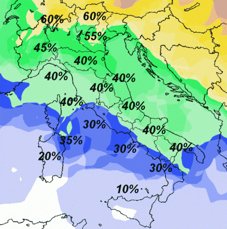 Sulle Alpi e l’alta Pianura Padana la probabilità resta MEDIO-ALTA, attorno al 55-60%. Sul resto del nord, gran parte del centro e il meridone (ad eccezione di Sicilia e Tirreno) la medesima probabilità sarà invece MEDIO-BASSA attorno al 35-45%. Sulle altre regioni invece probabilità BASSA, sotto il 30%