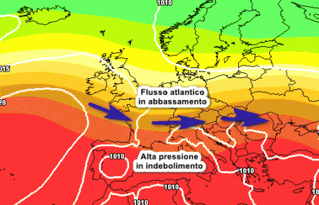 Il flusso atlantico dovrebbe abbassarsi fino a toccare le nostre regioni settentrionali e parte di quelle centrali. Oltre ad un benefico calo delle temperature, avremo anche il ritorno dei temporali segnatamente al nord e nelle aree interne del centro.