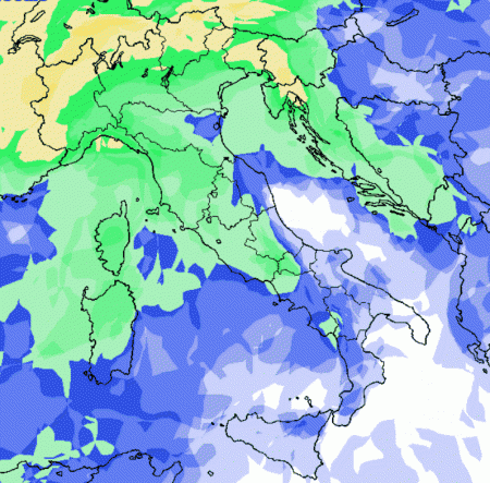 La probabilità di pioggia per il medesimo giorno viene giudicata ELEVATA sull’area alpina, le alte pianure e la Liguria, MEDIA sul restante settentrione e quasi tutto il centro, più BASSA invece al meridione e sulla Sicilia.