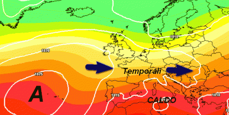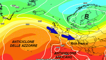 Ecco l’anticiclone delle Azzorre in Atantico e il flusso di correnti fresche ed instabili interessare l’Europa centro-settentrionale ed in parte il centro-nord della nostra Penisola, con un clima meno caldo ed alcuni temporali.