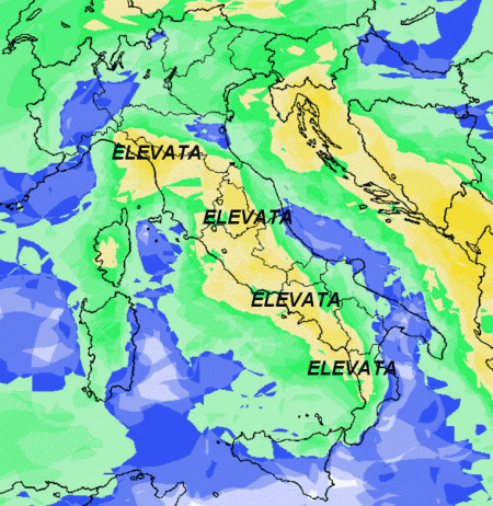 In prima fila per ciò che concerne le piogge, si nota il versante tirrenico e le aree interne peninsulari, dove la medesima probabilità viene giudicata elevata. Dove vedete il colore verde la suddetta probabilità sarà invece media, mentre il colore blu indica una probabilità di pioggia bassa.