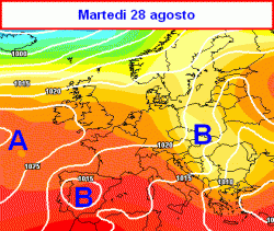 La prima mappa relativa a martedì 28 agosto, ci mostra un classico scenario meteo post-rottura.