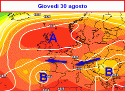 Il risultato di questa dinamica lo vediamo raffigurato nella seconda mappa previsionale valida per giovedì 30 agosto.