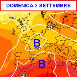 La cartina previsionale valida per domenica 2 settembre mostra il centro e il nord tra la braccia di temporali più o meno intensi. Le regioni meridionali e la Sicilia saranno interessate invece da un blando cuneo anticiclonico che garantirà condizioni di tempo migliore e più caldo.