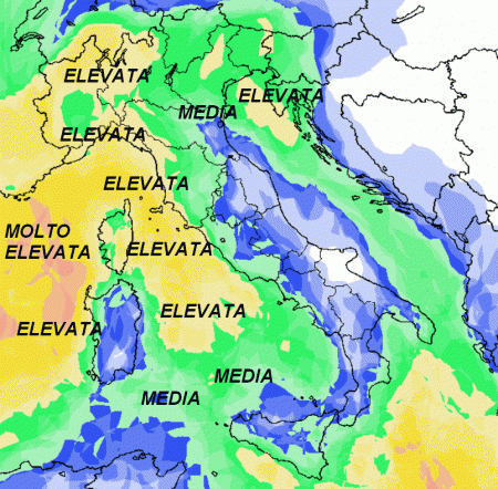 Il nord e il Tirreno con probabilità di pioggia ELEVATA o MEDIA. Dove vedete il colore tendente al blu la probabilità che possa piovere sarà invece più BASSA, ma contiano che l’acqua possa arrivare ovunque con una situazione siffatta.