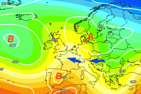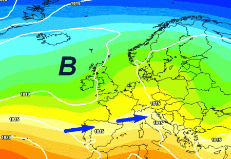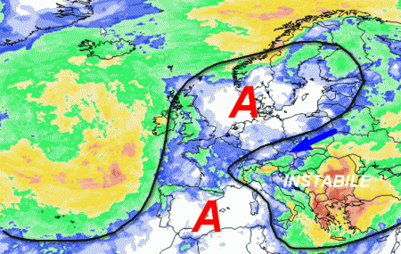 Si nota la spinta dell’alta pressione tra l’Europa occidentale e settentrionale con aria instabile da est sulla nostra Penisola e fenomeni specie al centro e al sud, ma possibili un po’ ovunque.
