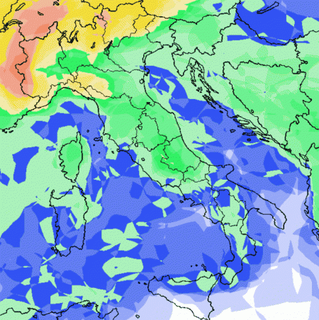 In altre parole, si ripeterà lo schema dell’alta pressione alle medio-alte latitudini europee, con il Mediterraneo e l’Italia sotto l’influsso di correnti fresche ed instabili orientali. Queste daranno luogo a piogge e rovesci sul nostro Paese, come viene mostrato dalla mappa della probabilità di pioggia a scala europea valida per il medesimo giorno. Vi ricordiamo che: In blu probabilità di pioggia bassa (sotto al 25%), in verde medio-bassa (fra 25 e 50%), in giallo medio-alta (fra 50 e 75%) e in rosso alta o molto alta" (oltre il 75%)