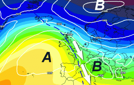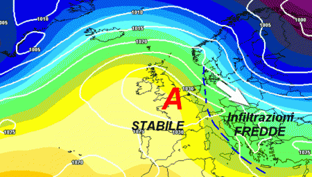 Alta pressione forte sui settori occidentali dell’Europa…più debole invece sull’Italia dove agiranno infiltrazioni fresche dai quadranti settentrionali che si faranno sentire essenzialmente sui settori orientali con qualche nevicata sull’Appennino centro-meridionale.