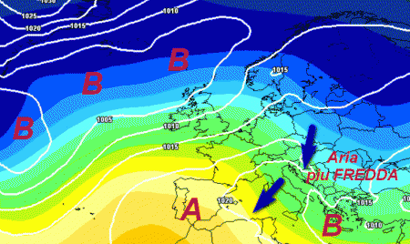 La radice dell’alta pressione potrebbe spostarsi più ad ovest. Ciò dovrebbe consentire l’ingresso di correnti più fredde verso l’Italia (frecce blu) e allora forse la stagione invernale potrebbe tornare a mostrarci un volto più consono.