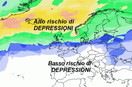 La mappa evidenzia che la pressione scenderà spesso sotto i 1000 hpa sull’Europa settentrionale, dove saranno presenti depressioni; sul Mediterraneo invece il medesimo valore pressorio non verrà valicato al ribasso in quanto sarà presente l’alta pressione.