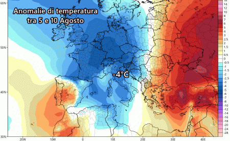 Eloquenti le anomalie termiche previste tra 5 e 10 Agosto sull’Italia. Si tratta di una mappa di anomalie medie su un arco temporale di 5 giorni. Si notano fino a -4°C di anomalia negativa (ovvero 4 gradi sotto le medie del periodo) su ben 5 giorni. Ma volendo andar più nel dettaglio, ovvero nei singoli giorni, spiccano anomalie di -8/-9°C rispetto alla norma nella giornata di domenica 6 Agosto.